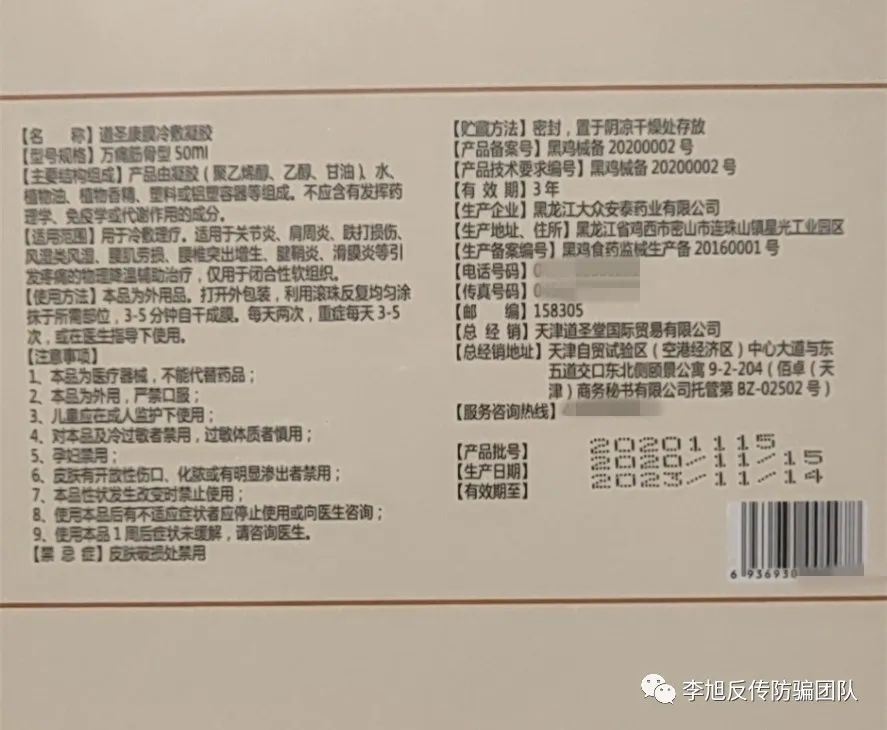 道圣康膜的外包装上写着“道圣康膜冷敷凝胶”,有械字号备案,可能是属于医疗器械类。但也不是药品,不含药物成分,不能代替药物功效。此外,李旭反传销团队在国家药监局数据库上查询,并没有查到其备案“黑鸡械备20200002号”的备案信息。