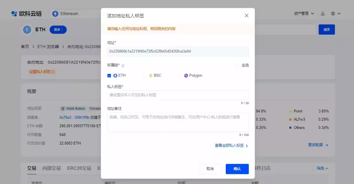这一作用在近日 OKLink 电脑浏览器详细地址宝贝详情更新后获得了进一步优化。现阶段地址宝贝详情增强了更多标签意见反馈,如详细地址相对应的实体线/组织、与一些风险事件的关联系数、并通过 OKLink 大数据算出地址特性,可帮助大家快速上手地址信息,进而根据自己的喜好设定个人标识。