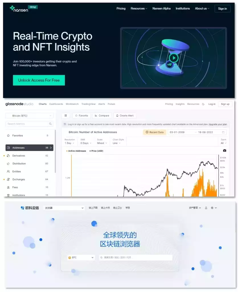 现阶段,市场已经涌现出一批有代表性的链上数据服务提供商,例如海外 Nansen、Glassnode 和国内 OKLink 等。他们造就了一批方便快捷可利用的数据专用工具,将巨大繁杂的公链链上主题活动数据收集下去,并且通过方式方法开展数据剖析,变成获得链上主题活动数据的关键信息来源。