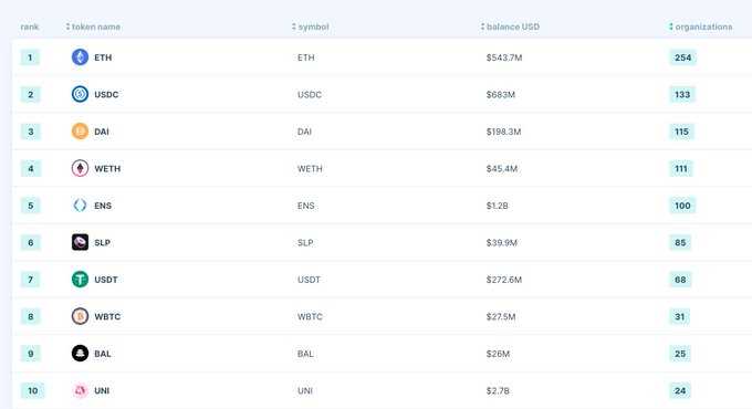 就拥有它们 DAO 来讲,ETH 仍是最热门的财产,其次 USDC。254 个 DAO 拥有约 5.43 亿美元 ETH。USDC为 6.83 亿美金,似乎是 DAI 两倍。