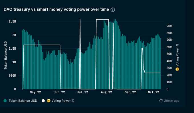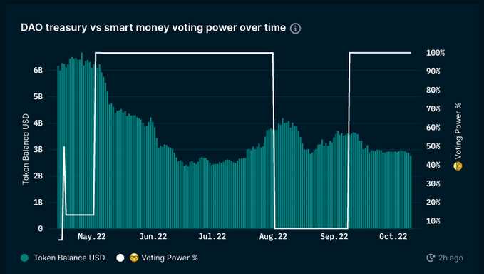 Uniswap 资金库则在全盛时期解决了大概 120 亿美金。在过去六个月里,它已接近尾 20 亿美金。在 35 万 DAO 货币持有人中,上一个月有 4.72 万网络投票(稍高于约 1.5% 的活跃性选举人)。