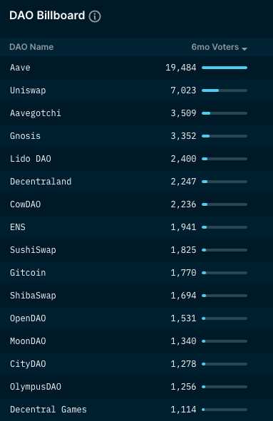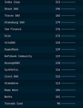 在过去的六个月中,仅有 1 个 DAO 有着超出 10,000 名选举人。尽管整治做为一个概念非常有趣,但 DAO 的关注度并没你想象中的那么高。Tornado cash 在 6 个月内有着 90 个 DAO 选举人。