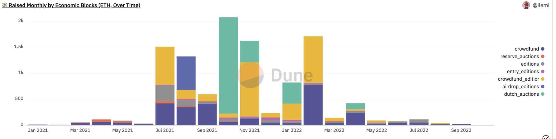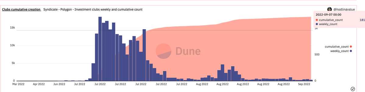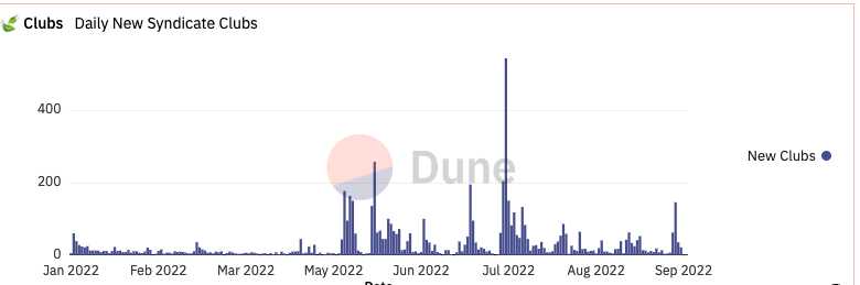考量 DAO 兴趣爱好的一个指标值是上线的“投资俱乐部”的总数。Syndicate DAO 再次协助在 9 月的单日高峰时段发布 100 好几个 DAO。伴随着零售利息的重归,大家有可能在一天内见到约 1000 好几个俱乐部队。