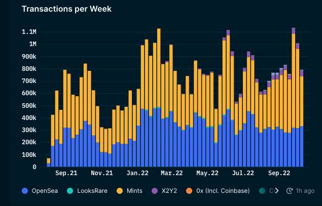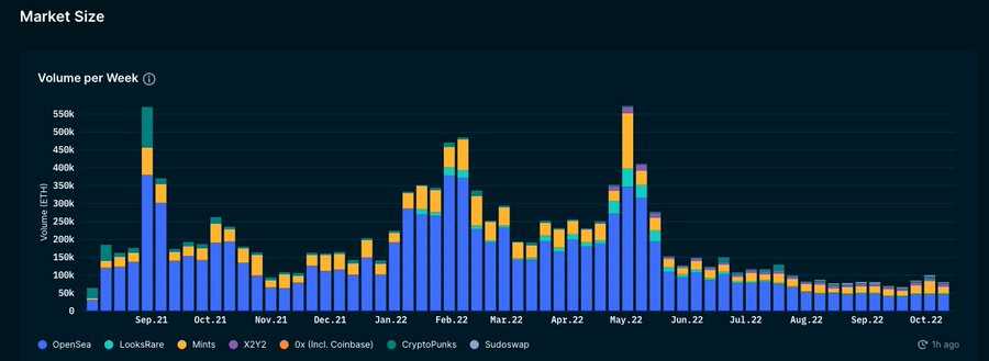这一年,NFT四周的交易量大幅度下降。对于此事,领域也已经完成了许多探讨。比如1. NFT 价钱的相对性下降(假如 TX 总数保持一致,往往会造成交易量降低);2. 股票投资风险下降。
