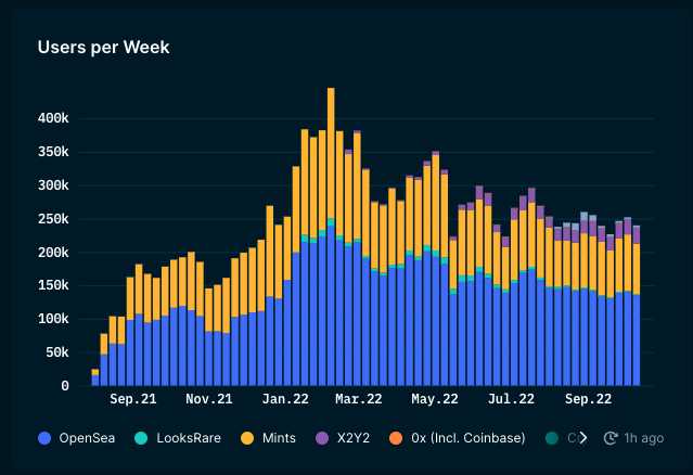 对这儿数据库的一个可能性的指责是,这种仅仅尘土钱包。可是,如果你查询此数据图表,探寻钱包返回特性。1. 新客户有一条平整线; 2. 目前客户并没有下降。有的话,他在 2 月达到一个新的 ATH。这也不是说 NFT 稳步增长。从价钱 pov 看来,NFT 投资者在ETH 价格下降以 ETH 计费的 NFT 价钱减少层面得到了严厉打击。