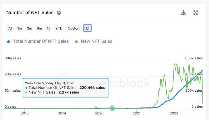NFT 销售量同期增长了大概 200 倍。从 1 月份每日约 2000 销售总额增至今日的 400000。到现在为止,正在发生 2300 千次 NFT 市场销售。
