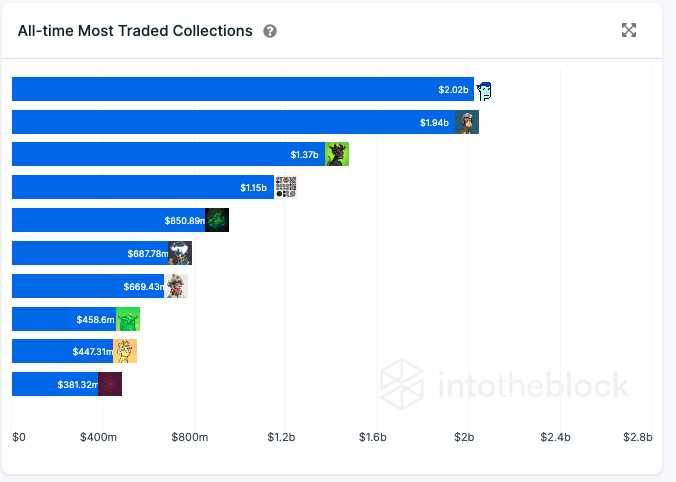 高价的 NFT 或多或少的变成了自已的资产类别。Bored Apes 和 Cryptopunks 的交易量各自贴近 20 亿美金。