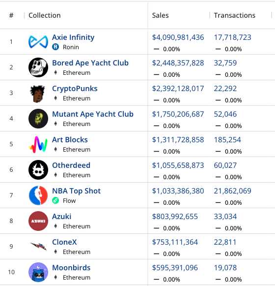 虽然在今年的有一定的下降,但 Axie Infinity 在 NFT 销售量层面还是处于领先水平。目前为止,Sky Mavis 的作品早已在他的个人游戏中实现了约 1700 千次买卖。仅仅在 2100 万笔买卖里被 NBA 头号人物战胜。