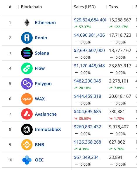 我发现了有意思的是,只有两块 NFT 占以太币(朋克风和 BAYC)交易量的约 20%。Solana、Polygon 和 Avalanche 等成本低连锁加盟店已经奋起直追,但是它们可能还需要另一个周期才可以扩大经营。