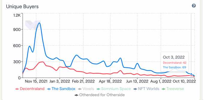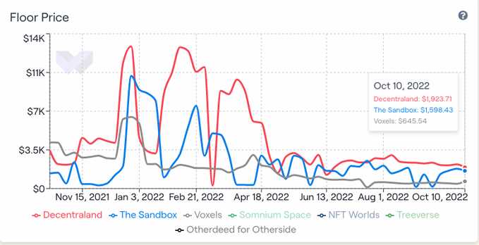 虚幻世界上对房地产行业的整体要求可能大幅度下降。Decentaland 上每平米土地负相关价已经从 70 美金降到约 12 美金。(与 BTC 和 ETH 价钱的下降有一些有关)