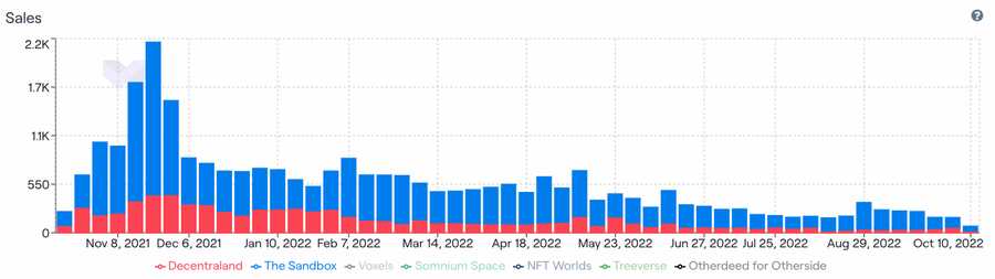 售卖的地块总数还在下降。这种虚幻世界工程中目前土地资源使用者的流通性下降的征兆。12 月的第一周,Decentraland 和 Sandbox 的销售总额大约为 2200 次。如今这个数早已下降到好几百 / 周了。