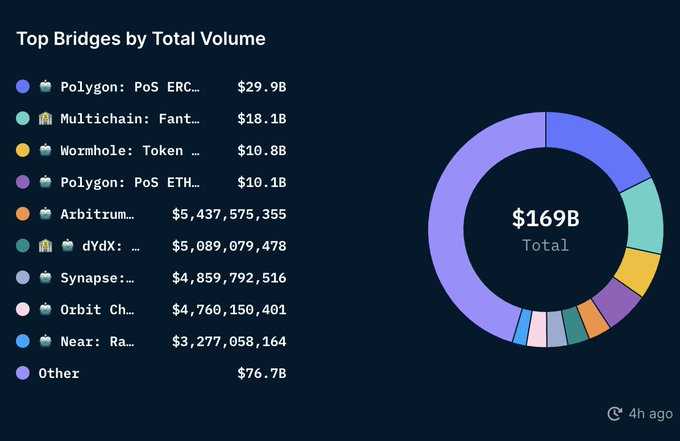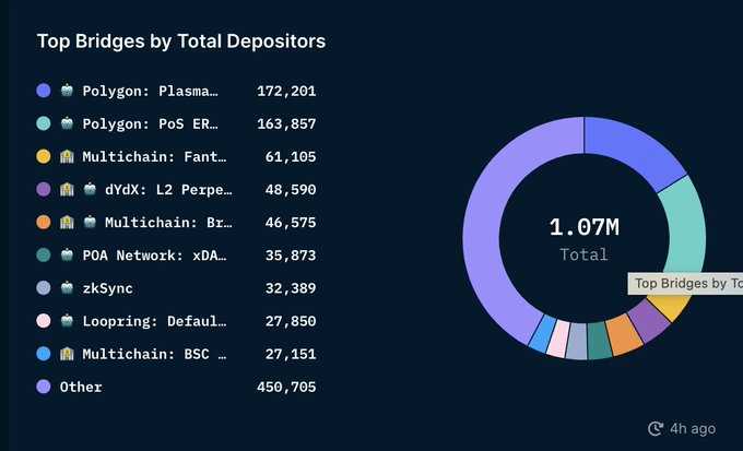 仅 Polygon 的公路桥梁就管控了大概 290 亿美元注入。见到好几个非链特殊公路桥梁的交易量超出 10 亿美金也让人印象深刻。聚合器可能为这个数放缩作出贡献。