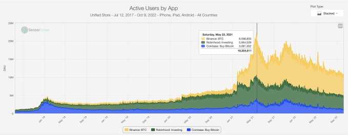 最终,我阐述了一些关于挪动应用程序的信息——和他们和传统组合得比较。下面的图检查了 coinbase、Binance 和 Robinhood 的 DAU。在全盛时期,Binance 的 DAU 似乎是 Robinhood 两倍(虽然它是一款全世界应用程序)。