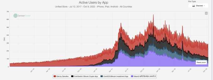 想要知道这类发展趋势会不会在印度这种区域市场不断存有,Zerodha 是这儿排名第一的股票买卖交易应用程序。你会看到人们对于数据加密的热情是怎样渐渐地涌向数据加密运用的 DAU 比已创建游戏的玩家多的程度。