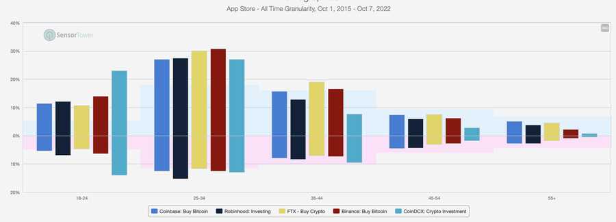 这种应用程序的人口统计数据大致类似。这种数据项目投资应用程序最大的用户群基本上一直 25-34 岁。Coinbase 有着十分庞大 gen-z 用户群。(顶端 = 男士用户群,底端 = 女士用户群)