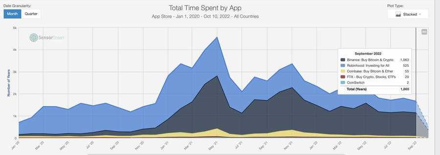 价钱下降并没有完全转化成花费在这种应用程序的时间大幅度下降。在全盛时期——币安网每一个月在这个应用程序上花的时间贴近 1800 年。这个数如今下降到约 1063 年,大家依然喜爱货币。
