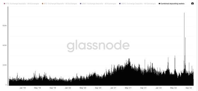 以这张数据图表完毕——它显示usdt、usdc、eth和btc的积累交易中心存进钱包。在 2019 年,它在某一天的态势大约为 60000。今日,这个数贴近 180000。