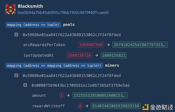 7、由于 memory 中获取的 Pool 值是旧的,其对应记录的 accRewardsPerToken 也是旧的会赋值到miner;