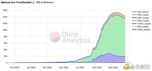 图2 以太坊链上比特币资产的TVL增长情况,数据来源:Dune Analytics