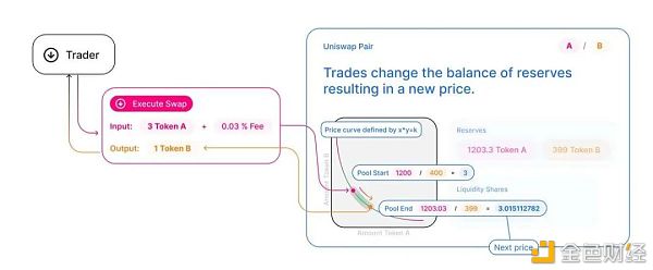 谈到这里就不得不说到Uniswap的本质是AMM去中心化交易所DEX。自动做市商(AMM)是创造两种Token的资金池,根据价格波动调整资金池中的Token数量,池子中的币越多,交易深度就越好,就越吸引用户的参与。