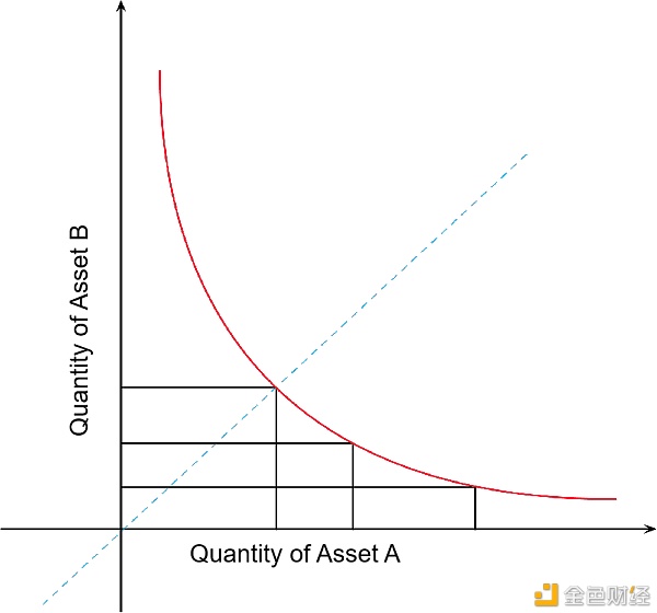 每个流动性储备池中存储两种加密资产,满足x*y = k的定价模型,x和y是两种加密资产的数量,K是恒定不变的常数,根据常规数学公式可知,乘积一定的两个函数成反比例函数关系,在x数量增加时,y则会减少。