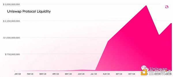 Uniswap协议目前拥有超过20亿美元的流动性,比2020年初的1200万美元增长了17倍。