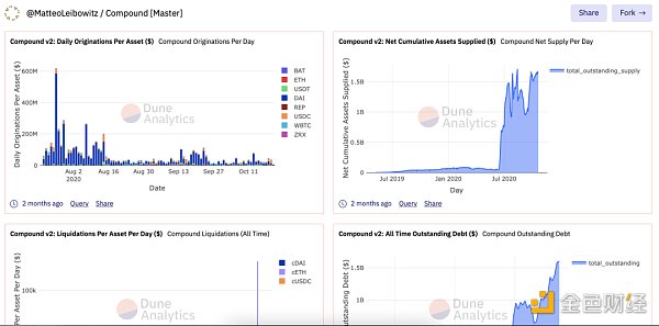 光是 Compound 单个平台的项目就有用户(@MatteoLeibowitz)为其创建了 16 个图表,可想而知,其他平台面临的可能是数据量不足的问题,而这个平台面临的则可能是数据爆炸的问题。