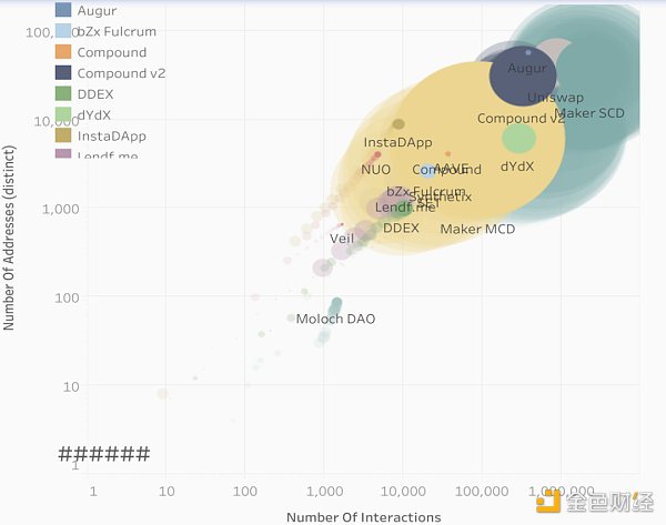 从统计的数据和呈现效果看,Alethio DeFi 数据站都有一些出彩的地方。它在主页展示了 10 个数据工具。其中一个是下面这样的,通过跟踪主要 DeFi 产品的用户(纵轴)、交互(横轴)和同时锁定的 ETH 来展示其演进,是不是即震撼又兼具美感。