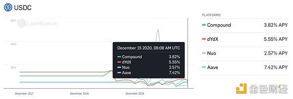 图为USDC在各平台上的历史借贷利率,来源:loanscan.io