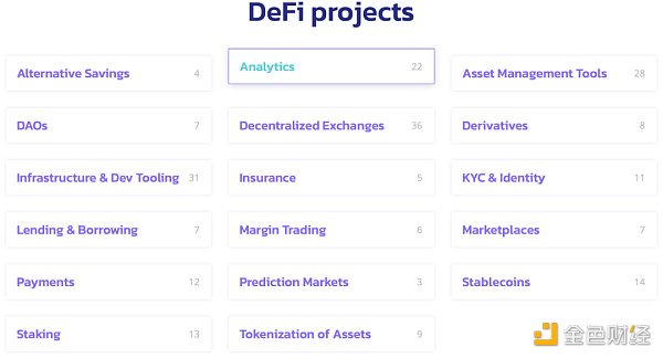 DeFi Prime?上收录了 200+ 个DeFi项目和数十个 DeFi 代币。比较有意思的是它把这些项目分为?17 大类,其中 DEX(36 个)、DeFi 基础架构和开发工具(31 个)、资产管理工具(28?个)数量最多。当然,这些产品自身并非尽是去中心化的,也不全是基于以太坊的,其他公链的还包括 EOS、Tron 等。