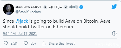 Kulechov在周六宣布了Aave的社交媒体项目。他在推特上写道,“由于Jack将在比特币上构建Aave,Aave应该在以太坊上建立Twitter。”