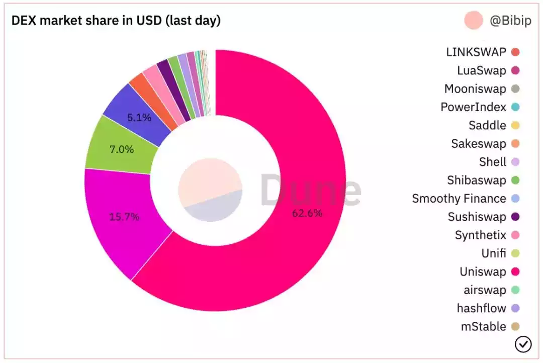 自 Uniswap V3 推出以来,他们拥有大约 7000 亿美元的交易量,在所有 Uniswap 不同版本的交易中占到 90%,此外以超过 55 亿美元的 TVL(2021 年 11 月达到 100 亿美元的峰值)占据 DEX 市场份额的绝大部分。
