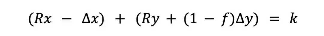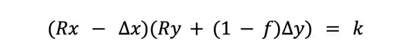 其中 Rx 和 Ry 是每个 Token 的储备,f 是交易费用,k 是一个常数。更简单的公式表示为: