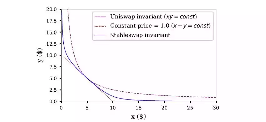Curves Stableswap 是一种特殊的 CSMM,流动池平衡时就是 CSMM,一旦池变得不平衡就会转向 CPMM,它通过找到自己的市场匹配度,显着减少了相关资产交易时的滑点。