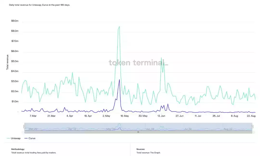在撰写本文时,Curve 的 TVL 确实比 Uniswap 高出约 5 亿美元,尽管其峰值 TVL 是 Uniswap 的两倍多(240 亿美元)。然而,在总量、收入和市值等各种其他指标中,Curve 始终排在 Uniswap 之后。