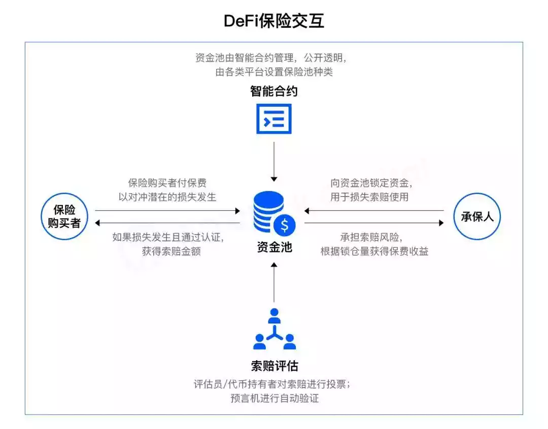 在 DeFi 保险中,有五个主要构成部分和角色:资金池、DeFi 保险平台、保险购买者、承保人、索赔评估员。