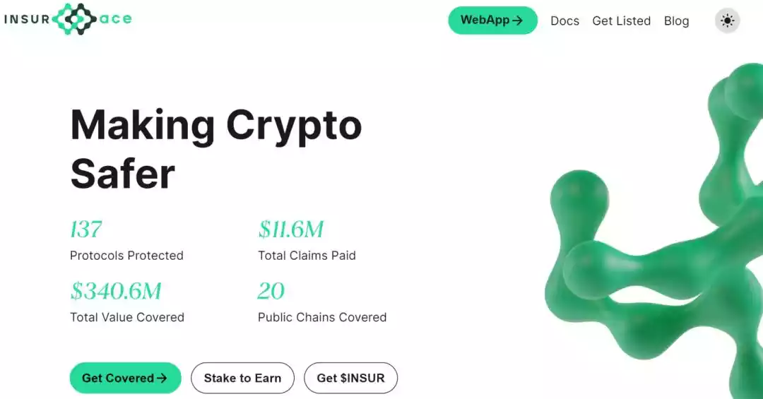InsurAce 成立于 2021,是第一个提供跨链投资组合的保险。用户可以购买智能合约、中心化托管、以及稳定币脱钩类保险,涵盖 137 个协议,兼容 20 个链。