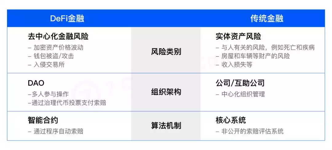 而 DeFi 保险则是由 DAO 组织管理,所有保险购买和索赔都由智能合约执行,保护各类链上资产,算法公开、透明。保单则由社区承担,任何人都可以成为承保人,承担风险、获得收益。