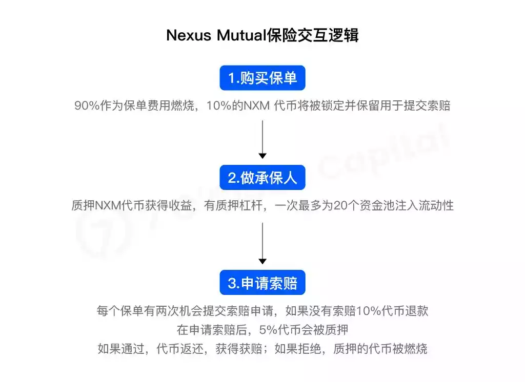 Nexus Mutual 有超过 100 个保单类型,用户可对这些合约进行 30 天以上的保期投保,每份保险都用原生 Token NXM 计价,并允许以 ETH 或 DAI 进行支付。用户也可以购买 NXM 享有治理权,或者质押 NXM 成为索赔评估者,NXM 均流入到资金池中。