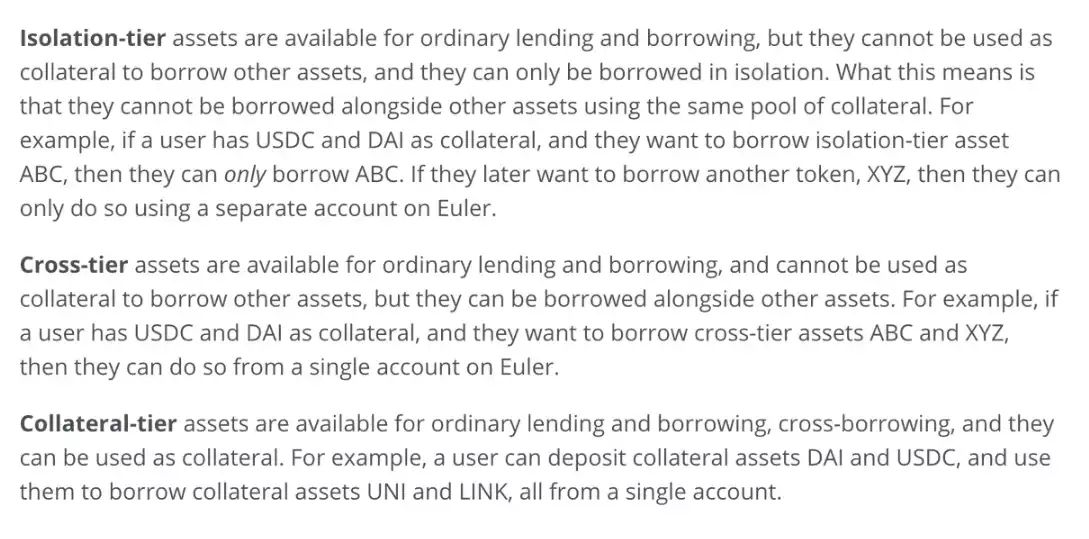 @eulerfinance 将资产分为隔离层、交叉式层和质押层(风险性较大到最少),促使Token被筹集资金、借出去或做为抵押物的同时还限定 Token 被筹集资金、借出去或做为抵押物。