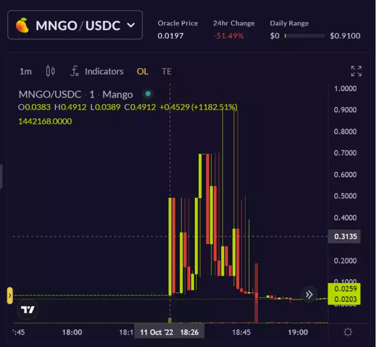 b) 控制价格:攻击者应用大量资产选购 MANGO Token ,在 10 分钟之内把它价格从 2 分升到 91 分。由于 MANGO 是一种流通性低 Token ,这也使得攻击者能够迅速控制价格。
