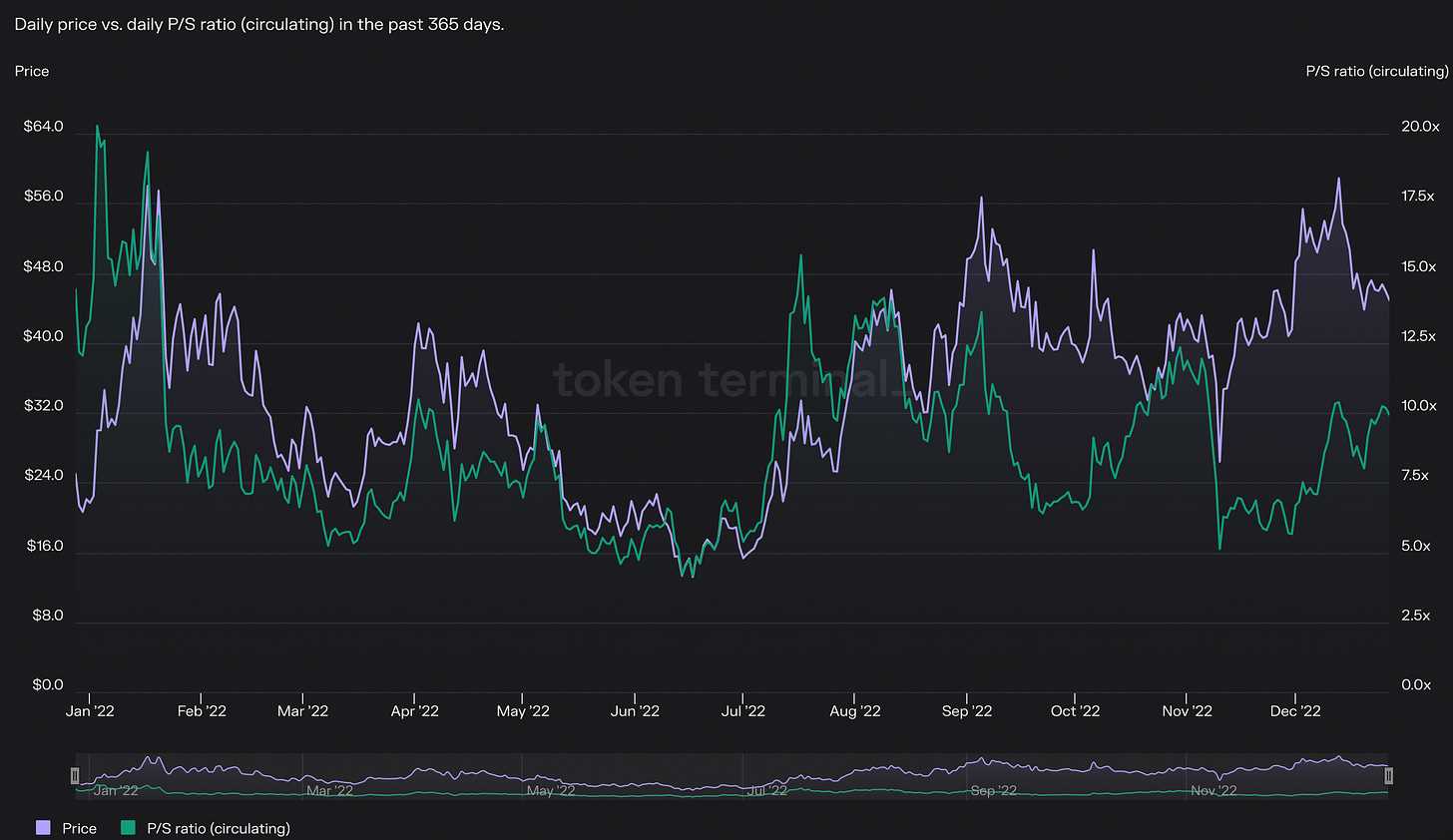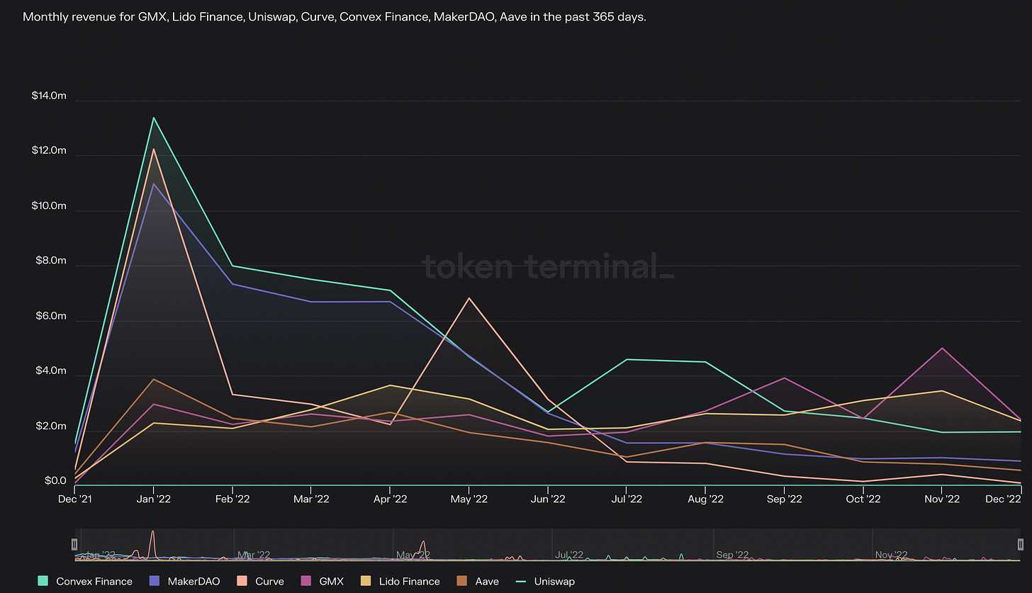 图中中,横坐标为花费,纵坐标为协议收入,花费可能还需要分给LP,收入才是和货币持有人有关的“真正收入”。总体来说, GMX/ Lido/ Convex 在熊市中依然拥有强劲收入,GMX/Lido 高考位次逆势上涨,此二者的币价还在年度主要表现不错。Curve/ AAVE/ MakerDAO 受股市熊市影响很大,而 Uni 则依旧是“毫无意义的治理代币”。