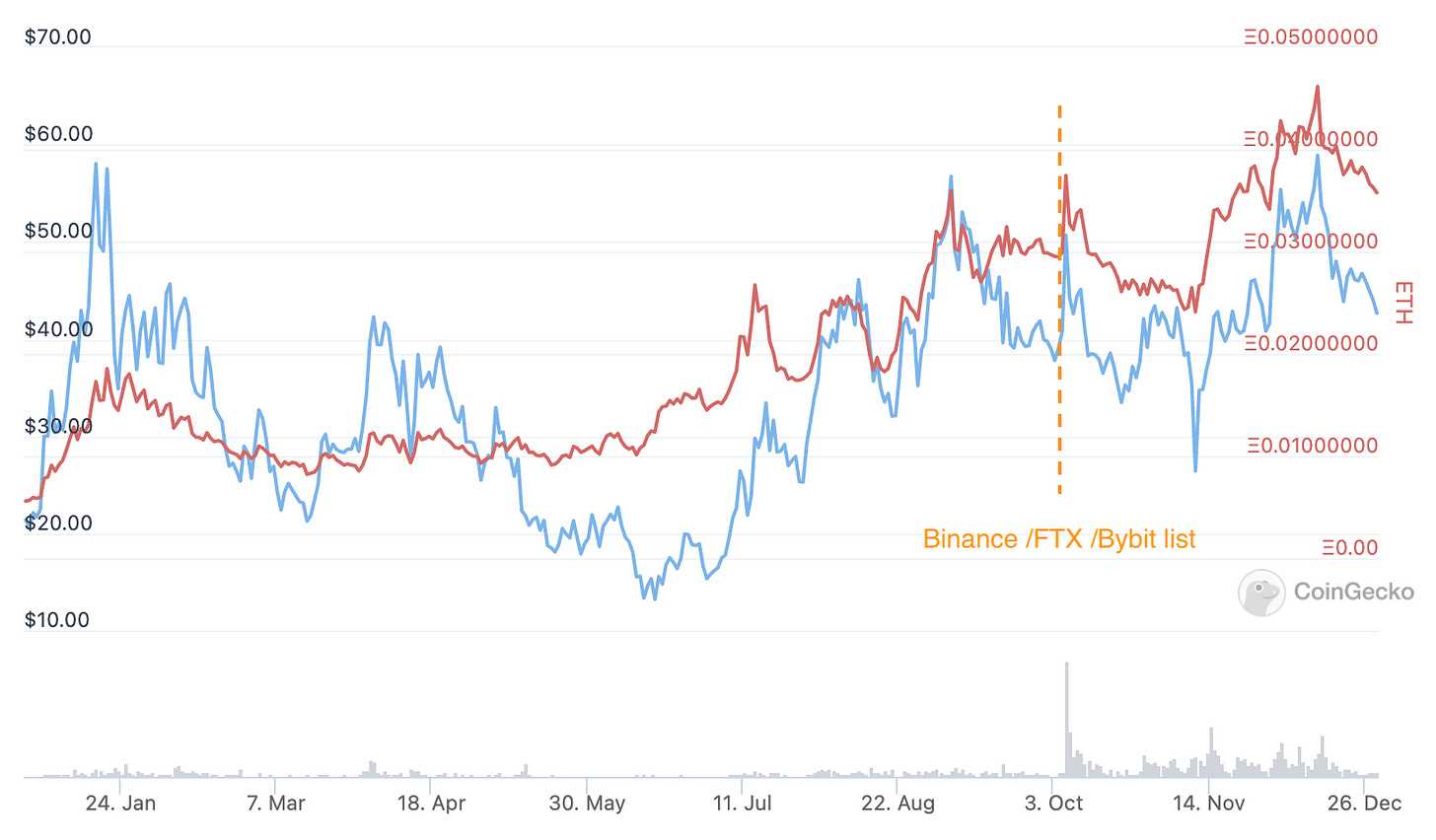 讲完股票基本面难题再议下危害价格的外在因素,除了 Dovey 等大牌明星 VC 不断一直全力支持 GMX 以外,今年 Bitmex 创办人 Arthur Hayes 也逐渐购买 GMX 并持有迄今。在10月初,GMX 本来仅预估发布 FTX, 可是币安网/Bybit 等交易中心出现意外快速跟进。GMX 并不往一切交易中心付款上币费,由此可见这种交易中心早已一直关心 GMX,最终迫于形势积极发布防止错过了网络热点。此外尽管价格增涨,但由于协议收入还在增涨,因此公司估值长期保持, FDV/协议收入在 10 左右起伏。