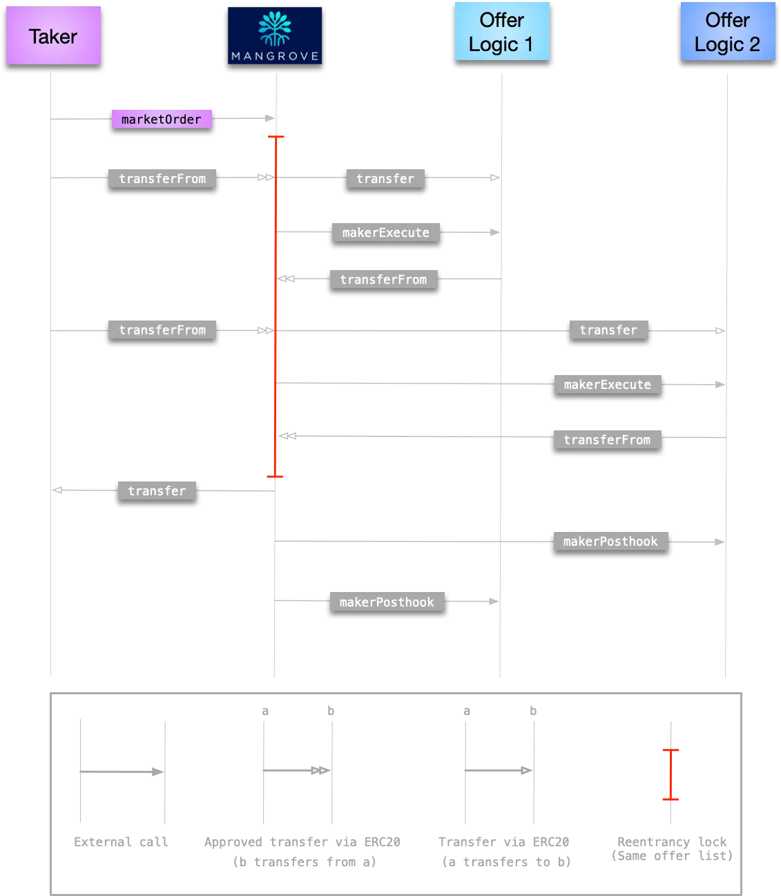 当报价与吃单匹配时,Mangrove 将初次调用 Maker contract 的报价逻辑。这次调用紧接在交易结算之前,可让挂单方从其他地方调来流动性并即刻用于交易。通过在 Maker contract 中加入防御性代码,这个发生结算前的逻辑调用,还可让挂单方在某些会产生不利影响的特殊情况下拒绝这次交易。