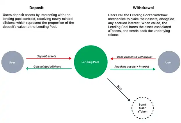· 当用户提取他们的资产时,他们的 aToken 将被销毁。这些已销毁的 aToken 保持其他用户所拥有的 aToken 的总量与他们的份额成比例,这些份额是在用户资产提取之后的。