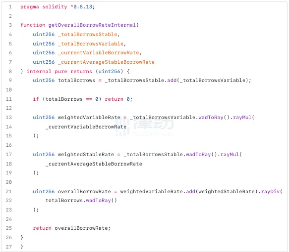 正如我们可以在 DefaultReserveInterestRateStrategy.sol 合约中看到的那样,liquidityRate 是通过以下方式定义的: