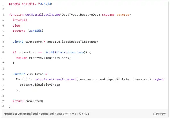 上述提到的Token数量然后乘以 getReserveNormalizedIncome 的结果,该函数执行以下逻辑: