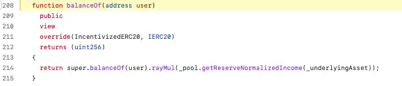 在此,该 balanceOf 函数覆盖了继承的 aToken 合约中的 balanceOf 函数。结果,该示例逻辑中的 balanceOf 逻辑被执行,而不是用户Token数量的常规(继承)映射查找。