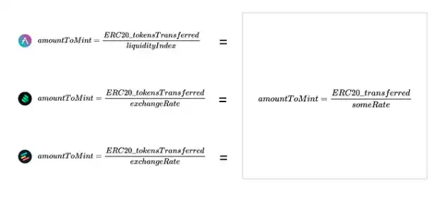 虽然我们不能将每个协议的汇率归纳为一个式子,但对于 AAVE2 和 Compound,我们知道汇率是市场中总流动性的函数。回到我们的方程式,给定 totalLiquidity 是市场中 ERC20 基础Token的总量,那么在 exchangeRate 表达式的分子中和 liquidityRate 的分母中的分子是功能上相同的。