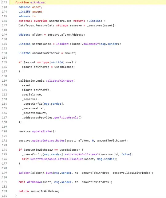 在这里,aToken 合约的 balanceOf 函数有点奇怪。毕竟,我们刚刚确定铸造的 aToken 数量与存入的基础资产数量不同。调用 IAToken(aToken).balanceOf(address(user)) 如何产生用户即将提取的基础资产数量(如在函数底部所示)?原因如下: